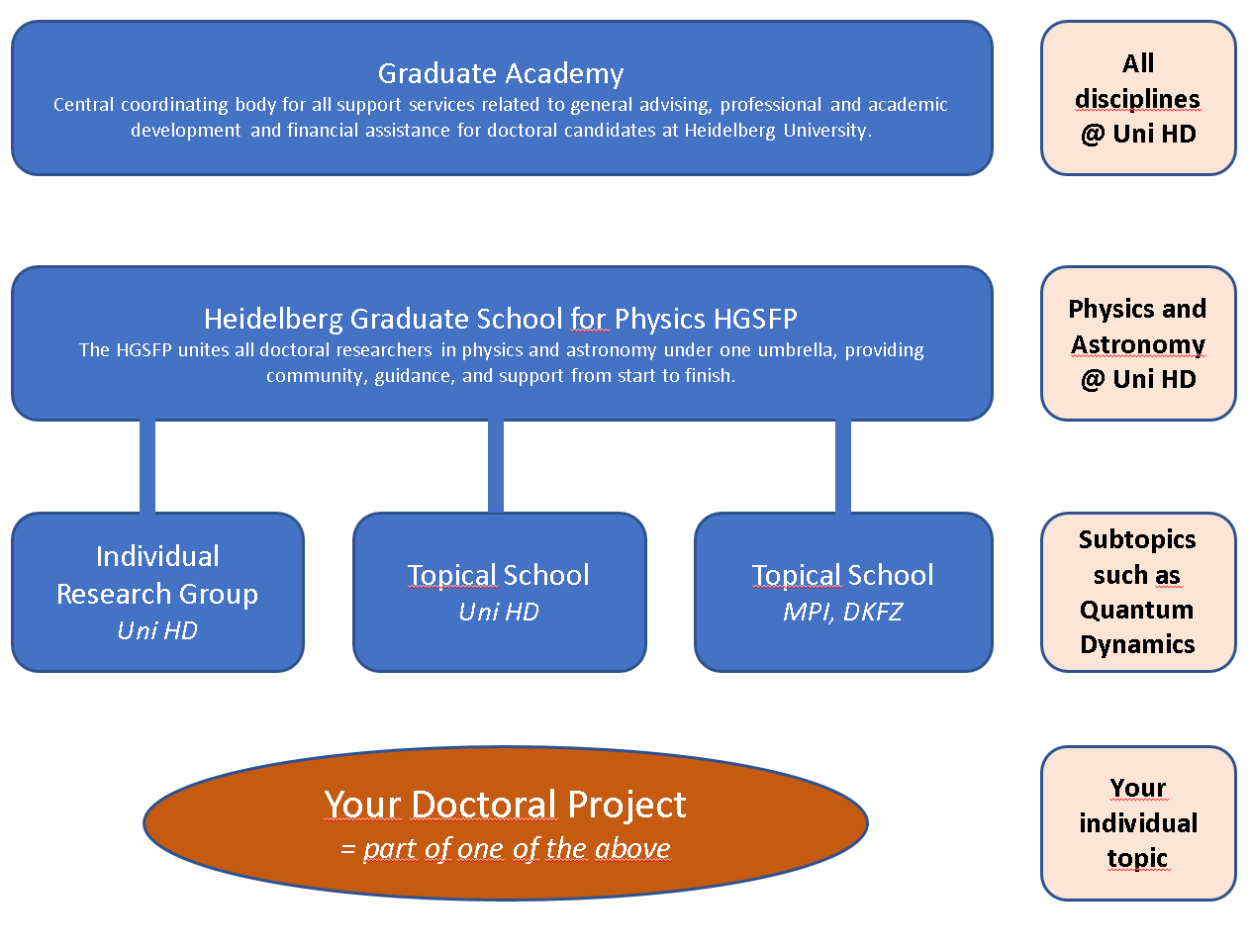 Doctoral students of the Heidelberg Graduate School for Physics can concurrently be admitted to one of the topical graduate schools in physics located in Heidelberg. (However, students of these schools must be admitted to the HGSFP).